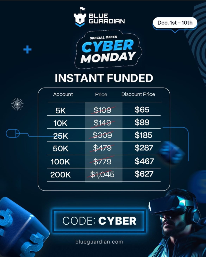 • Blue Guardian offers Cyber Monday discounts on instant funding accounts, allowing traders to start trading immediately.